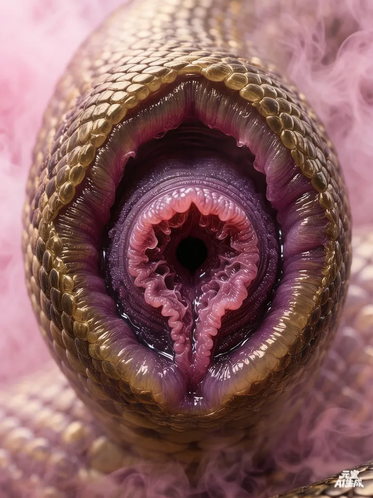 * 新器官的萌发:在多次成功“进食”后,尤其是获取了“高质量”的养料后,一些“粉红眼”的异化会走向更加极端、专门化的方向。在它们的下腹部、尾巴根部,或其他符合其物种解剖结构的位置,皮肤会开裂,形成全新的、专为“深度捕食”设计的腔道式器官。这些器官内壁布满极其敏感的神经末梢、丰富的血管、以及高效分泌“催情露”的腺体;内部结构可能是螺旋状的褶皱,或布满可自主蠕动的肉质突起和吸盘,以确保最大限度地刺激猎物、榨取养料,并防止其逃脱。这类高度异化的个体,通常更具攻击性,狩猎效率也更高,散发出的“蜜雾”几乎能让一定范围内的男性瞬间失去抵抗意志。